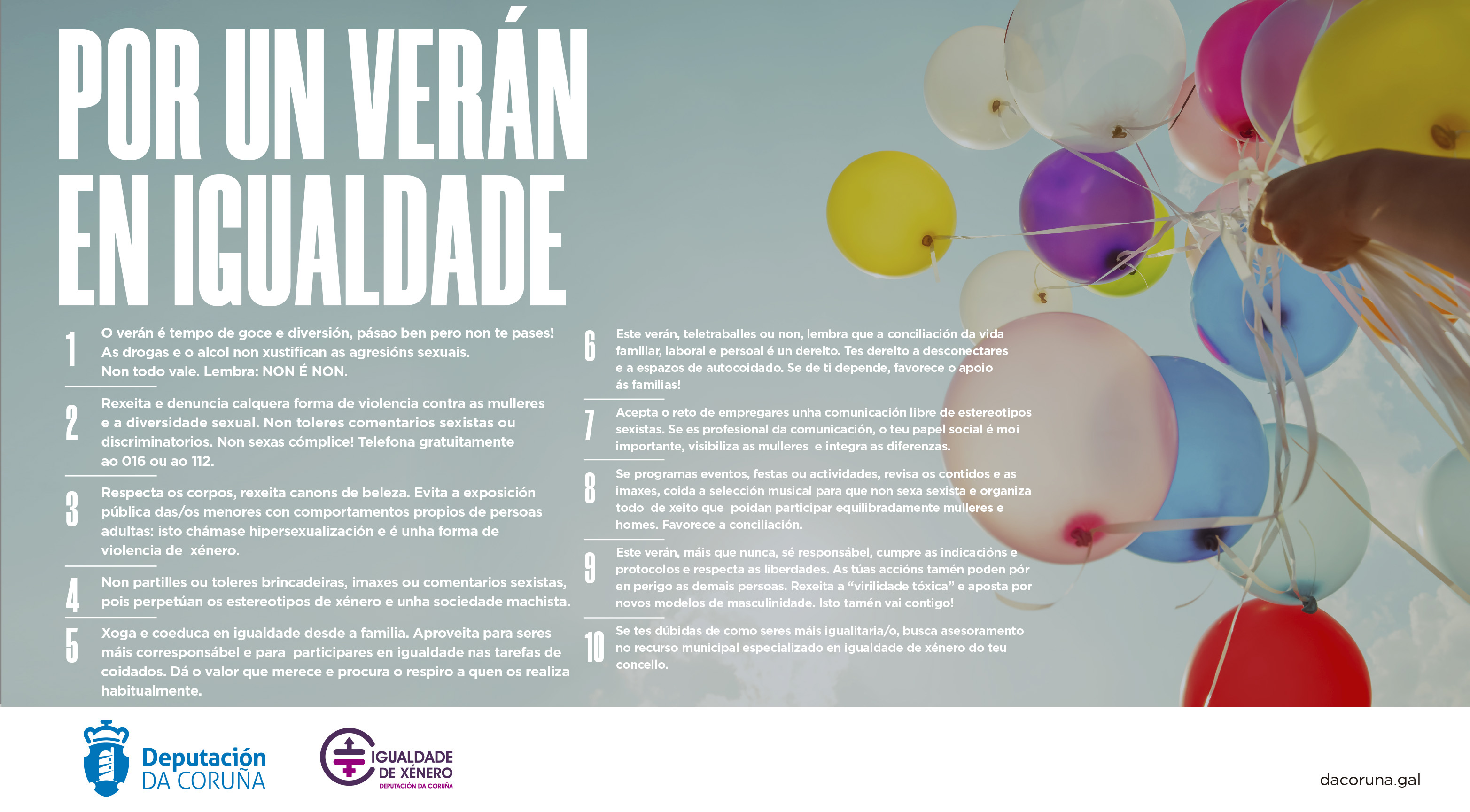 Desde Igualdade da Deputación da Coruña ponse en marcha no marco do seu Plan de Igualdade 2018/2023 (www.compartimosplan.com) unha campaña para promover unhas festas en igualdade, este proxecto comezou no Nadal de 2019, continuo no Entroido 2020 e finaliza co Decálogo por un verán en igualdade.