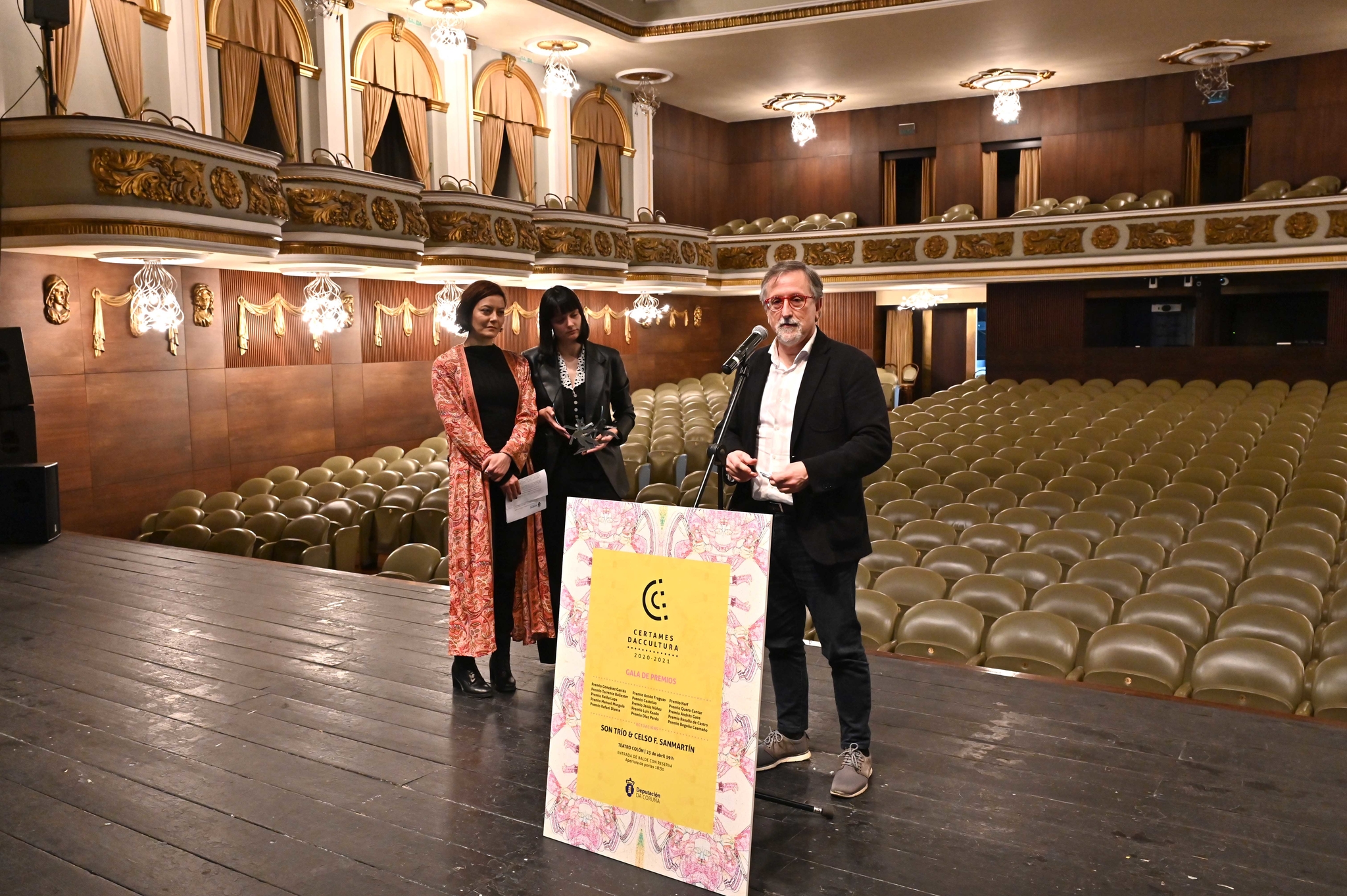 O escenario do Teatro Colón acolleu esta mañá a presentación de Gala de Premios culturais da Deputación correspondentes aos exercicios 2020 e 2021, que subirá precisamente a ese mesmo escenario a 31 persoas premiadas e reunirá no propio teatro a preto de 150 persoas que participaron de xeito directo no desenvolvemento destes premios, entre xurados, comisariados e comisións lectoras.