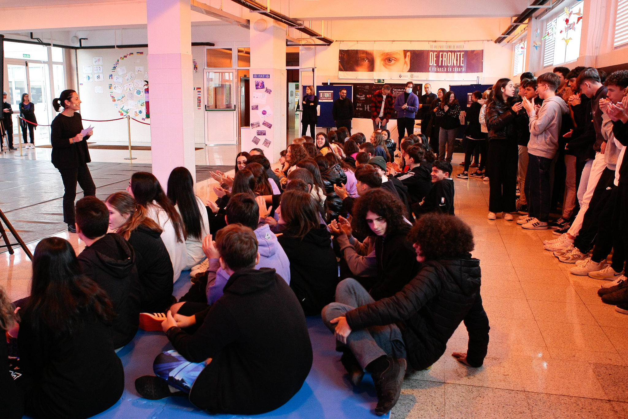 Como exemplos de visibilización deste tipo de situacións, tras a intervención da Deputada de Igualdade, a actriz Marta Ríos puxo en escena unha peza de micro teatro na que representou ante o alumnado unha situación de grave situación de violencia machista nas redes. Esta actividade presencial, compleméntase cunha serie de vídeos protagonizados por Melania Cruz e que están dispoñibles na web da campaña defronte.gal, para sensibilizar sobre diferentes situacións reais de violencia dixital e ofrecer ferramentas contra o ciberacoso, o 'sexting', sextorsión ou o 'groomin'.