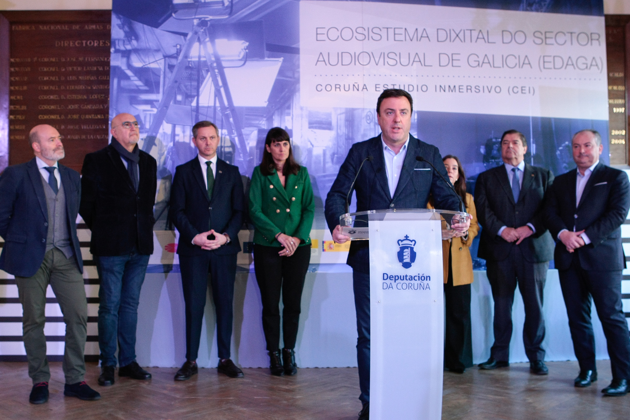 O presidente da Deputación, Valentín González Formoso, estivo acompañado de María González Veracruz, secretaria de Estado de Telecomunicacións e Infraestruturas Dixitais, Inés Rey, alcaldesa da Coruña, Julio Abalde, reitor da UDC e do presidente do Clúster Audiovisual Galego, Jorge Algora