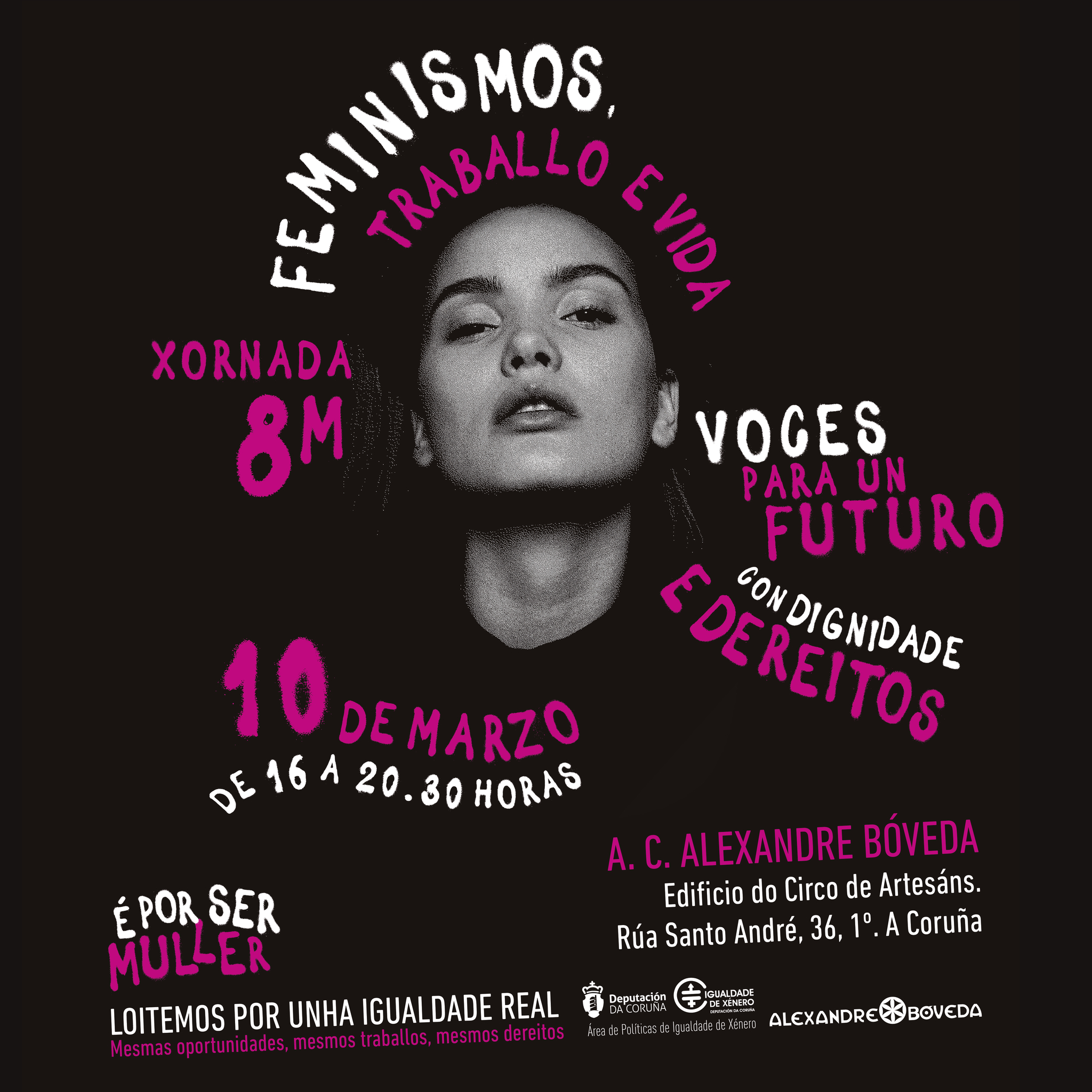 A programación de foros de debate e reflexión, de relatorios e de espectáculos reivindicativos da campaña que está a realizar a Deputación con motivo do 8M, arranca mañá pola tarde na AC Alexandre Bóveda da Coruña