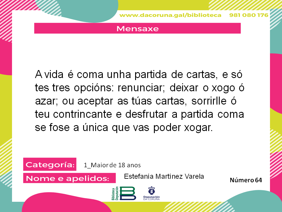 "A vida é coma unha partida de cartas, e só tes tres opcións: renunciar; deixar o xogo ó azar; ou aceptar as túas cartas, sorrirlle ó teu contrincante e desfrutar a partida coma se fose a única que vas poder xogar."