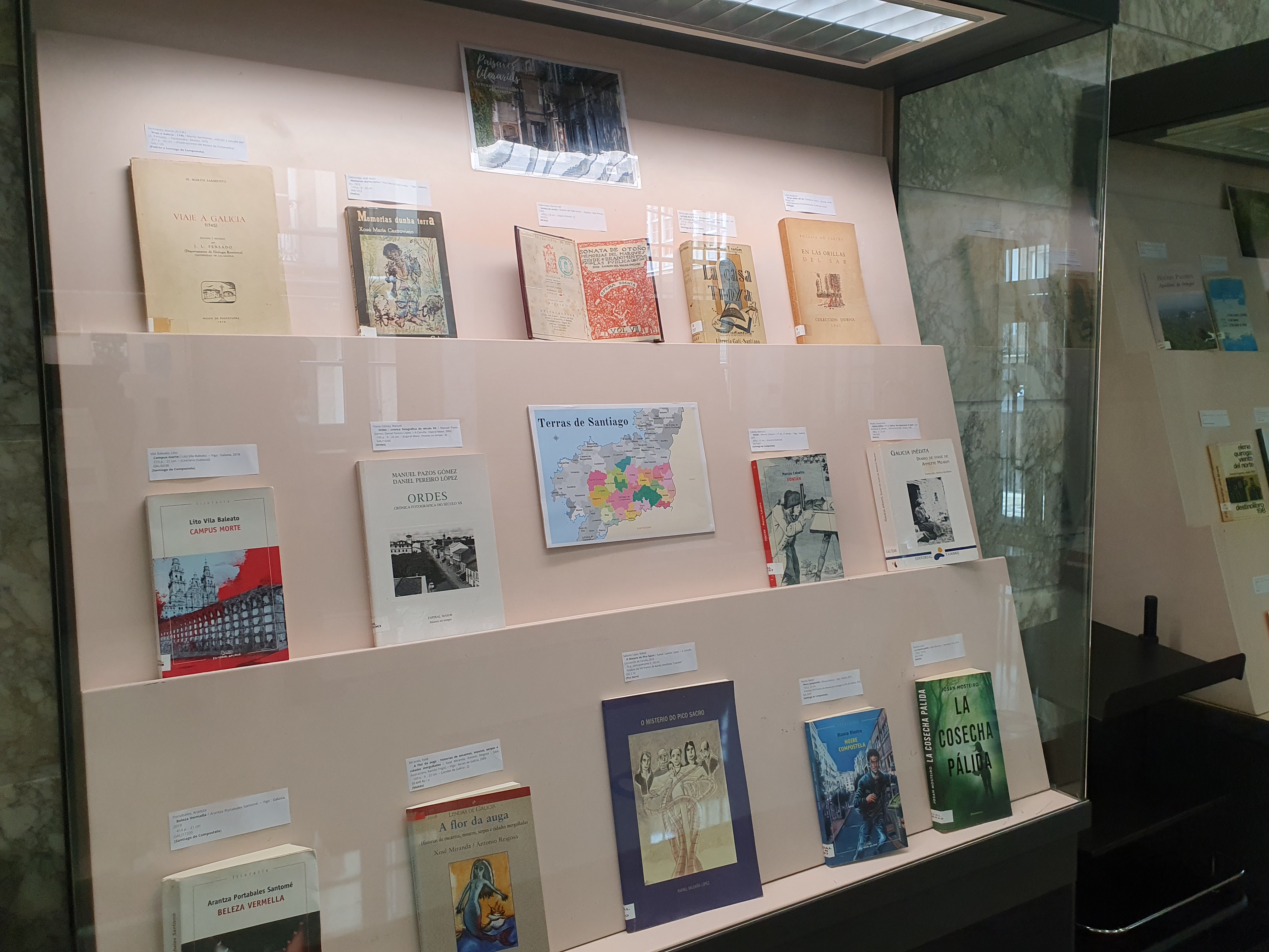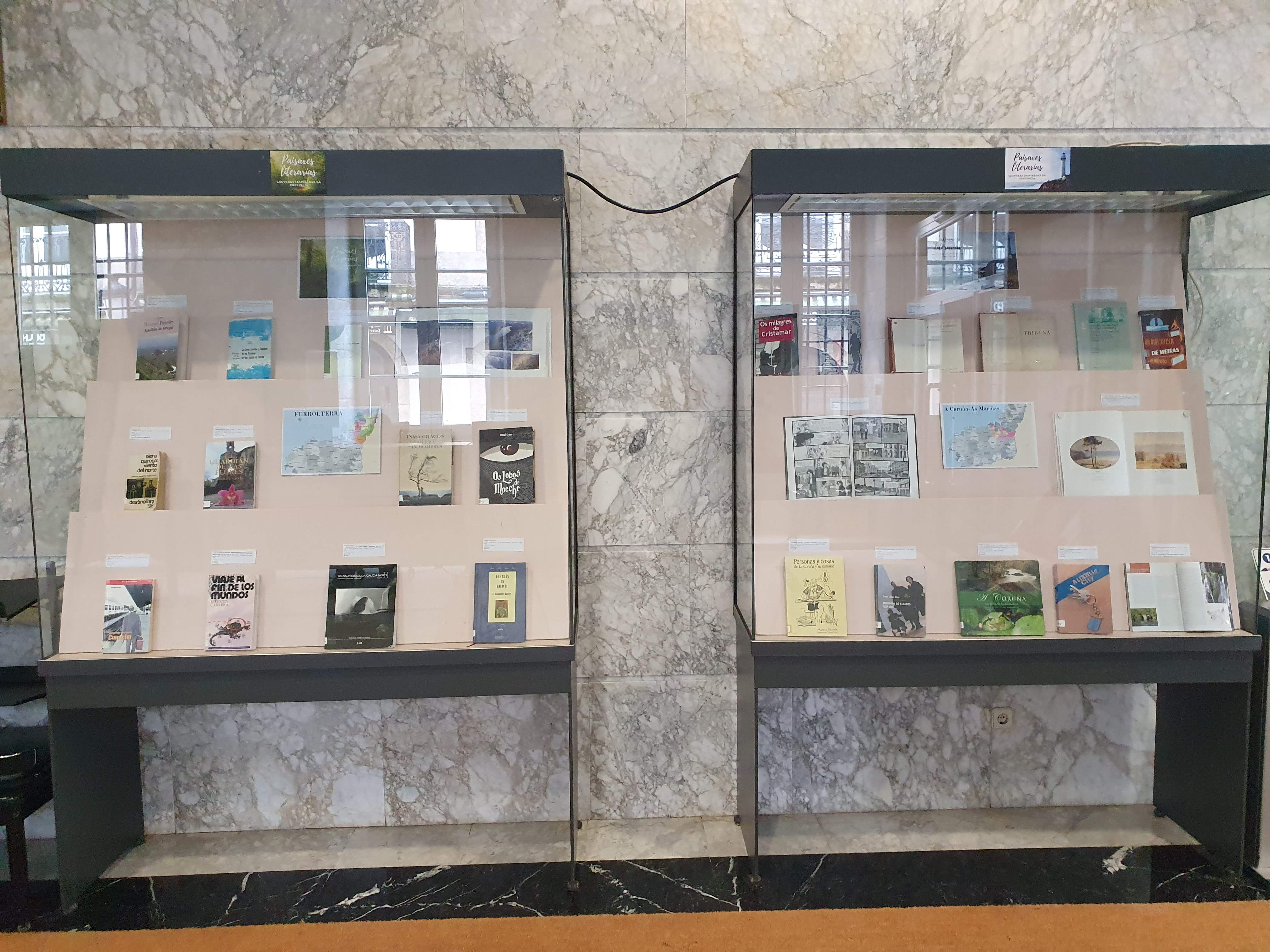 Mostra bibliográfica dispoñible no vestíbulo da Biblioteca sobre literatura ambientada na provincia da Coruña.