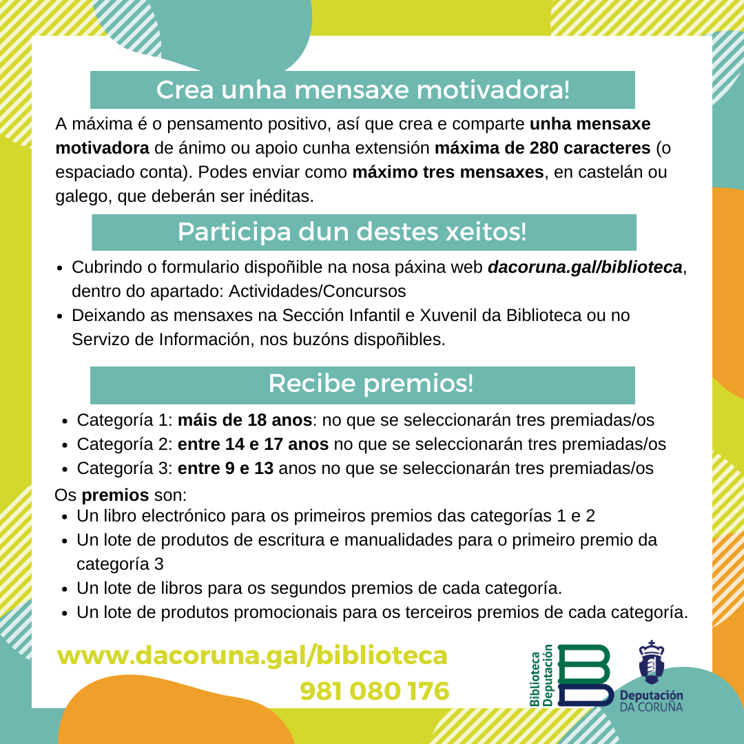 Buscamos mensaxes positivas que nos impulsen e melloren no noso día a día, palabras de ánimo e apoio para compartir e animar entre os diferentes grupos de idade. Se queres tomar parte desta marea de positivismo, e tes máis de 9 anos, anímate a participar a través da nosa web ou na propia Biblioteca, escribíndonos esa mensaxe que vai empuxarnos a afrontar a vida dun xeito máis positivo!