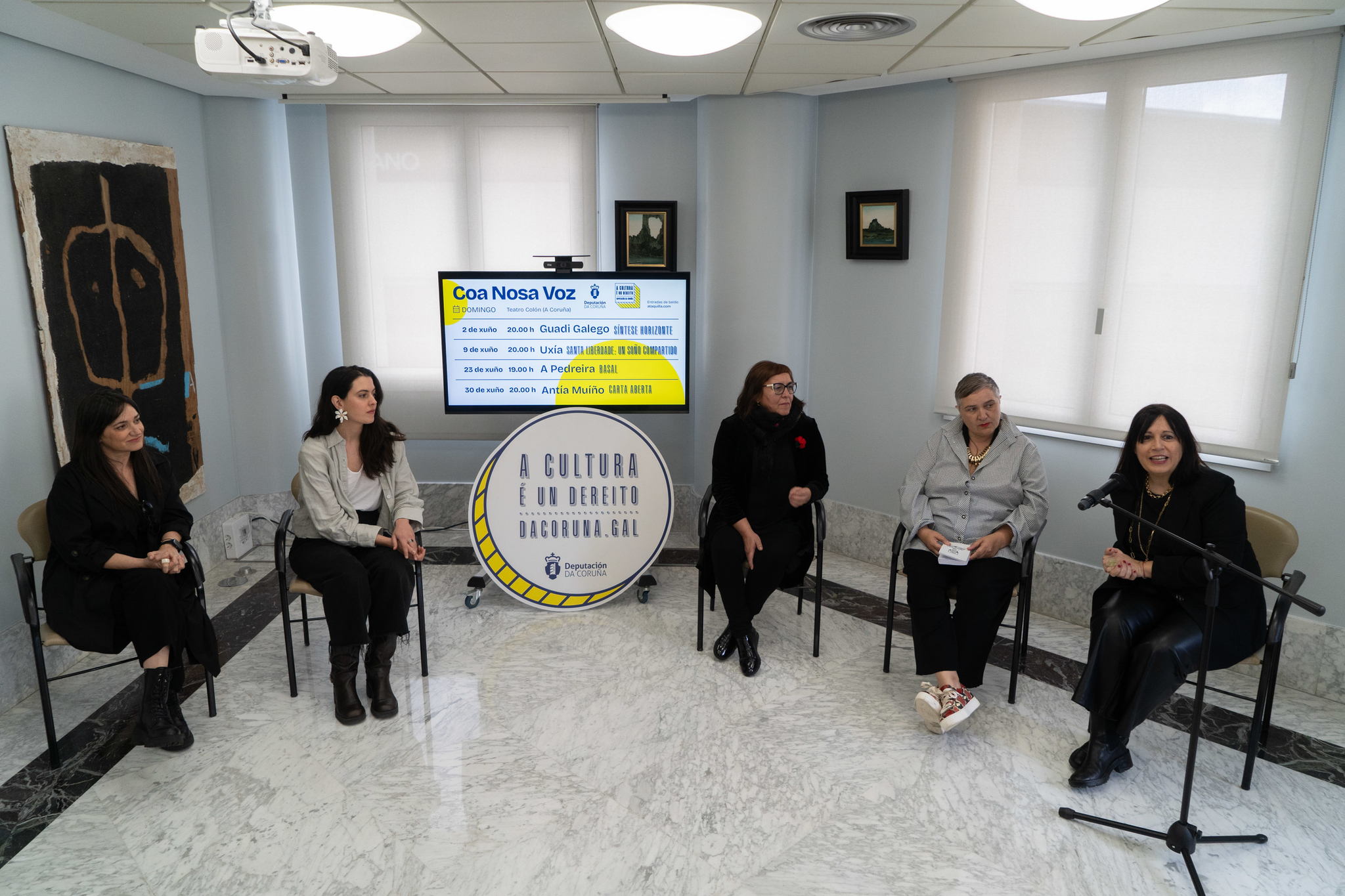 A área de cultura da Deputación promove o ciclo Coa Nosa Voz, que se celebrará no Teatro Colón os días 2, 9, 23 e 30 de xuño, e acollerá as actuacións de Guadi Galego, Antía Muiño, Uxía e Ugía Pedreira. As entradas poderán retirarse dende hoxe, de balde, na páxina web de ataquilla.com. Así o anunciou esta mañá a deputada de cultura, Natividade González, acompañada das catro artistas que protagonizan o cartel, "catro voces moi diversas, de diferente procedencia, xeracións, e estéticas, pero todas elas mulleres de referencia no panorama da música galega e nacional", apuntou.