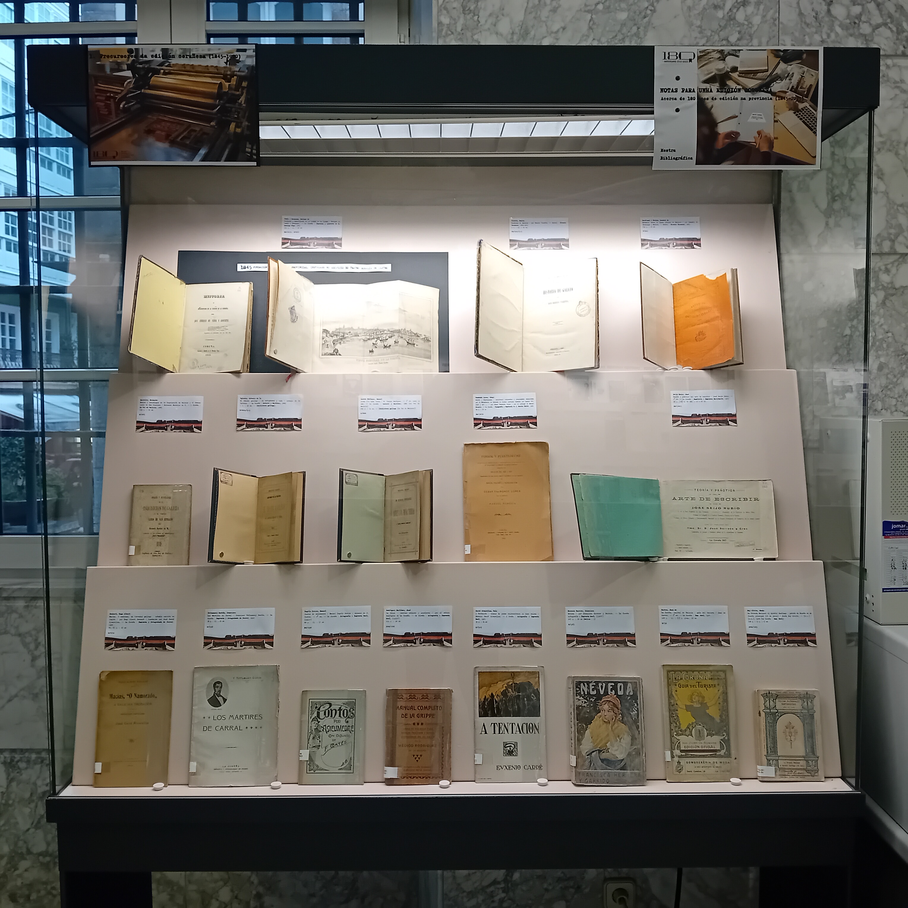 A data de nacemento da Biblioteca Provincial, 1845, será a escollida como inicio do período ao que presta atención a Mostra. Esta primeira vitrina presenta unha serie de establecementos dedicados á actividade impresora, algúns deles reciben o nome do seu fundador, feito habitual na época. Estes son: Nicasio Taxonera, Domingo Puga, Roel, Latorre e Martínez, Fotogravado Ferrer e F. García Ybarra.