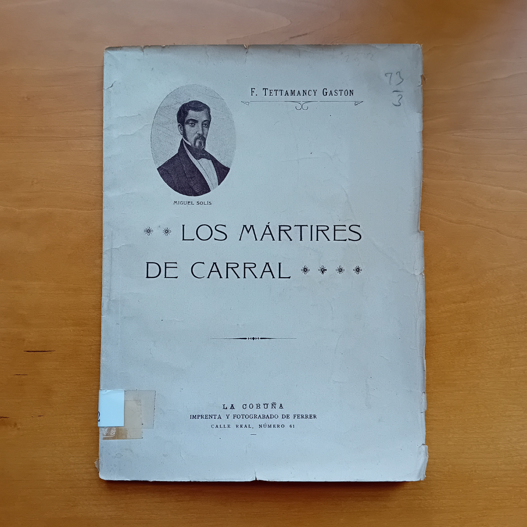 A segunda das obras é Los mártires de Carral, de Francisco Tettamancy Gastón. Tettamancy foi un historiador e escritor coruñés, ademais de Funcionario da Deputación Provincial da Coruña. Tamén foi membro fundador da Real Academia Gallega, correspondente da Real Academia de la Historia e da Real Academia de Bellas Artes de San Fernando e vogal da asociación rexionalista Liga Gallega na Cruña. Esta última é a organización da que parte a iniciativa de levantar o monumento Aos Mártires da Libertade en Carral, sendo o propio Tettamancy un dos seus impulsores. Esta publicación presenta un estudo histórico moi documentado da Revolta Galega de 1846. Conta con diversas ilustracións en branco e negro acompañando ao texto, algunhas delas creadas pola propia, "Imprenta y Fotograbado de Ferrer".