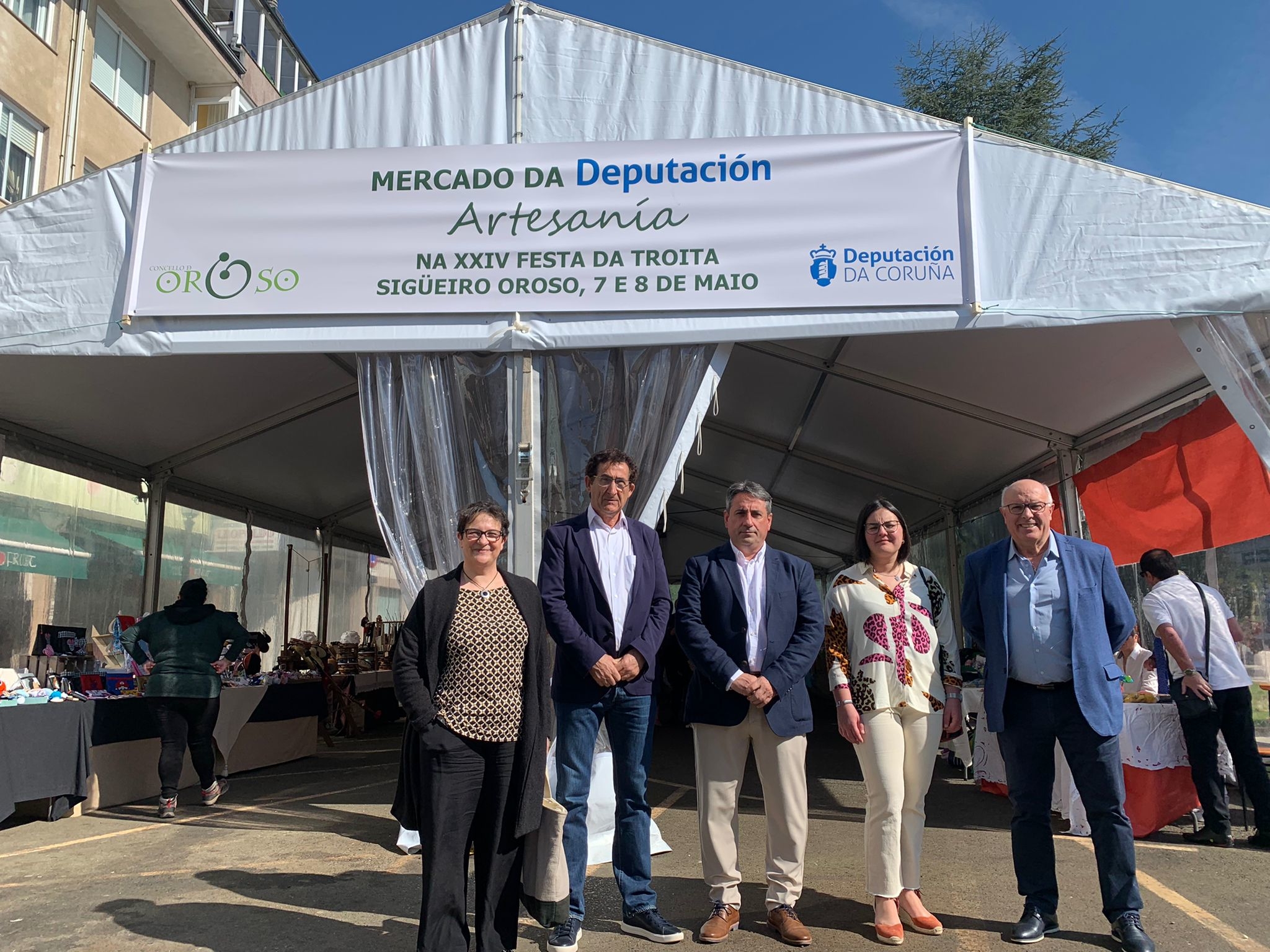 O deputado provincial Antonio Leira e o alcalde de Oroso, Luis Rey Villaverde, inauguraron esta mañá a Feira de Artesanía incluída na programación de actividades da XXIV Festa da Troita de Oroso, que celebra mañá o seu día grande co presidente da Fegamp, Alberto Varela, como pregoeiro.