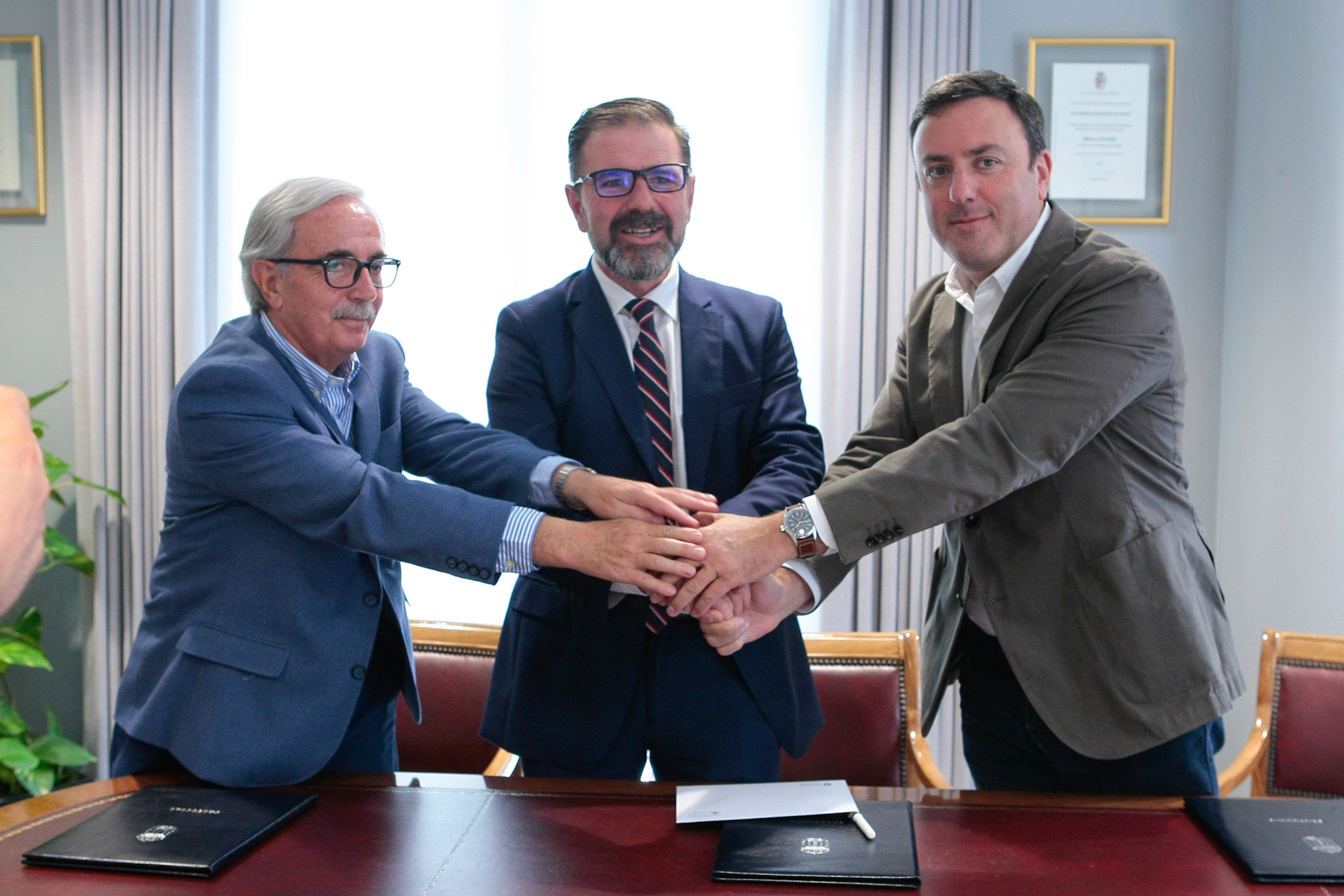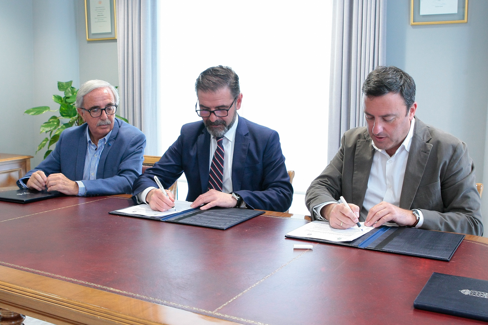 O presidente da Deputación da Coruña, Valentín González Formoso, e o alcalde de Ferrol, Ángel Mato, asinaron esta mañá na sede da institución provincial o convenio entre ambas administracións para o o financiamento das obras de renovación do sector norte do estadio municipal da Malata. O acto contou tamén coa asistencia do presidente do Rácing de Ferrol, José María Criado.