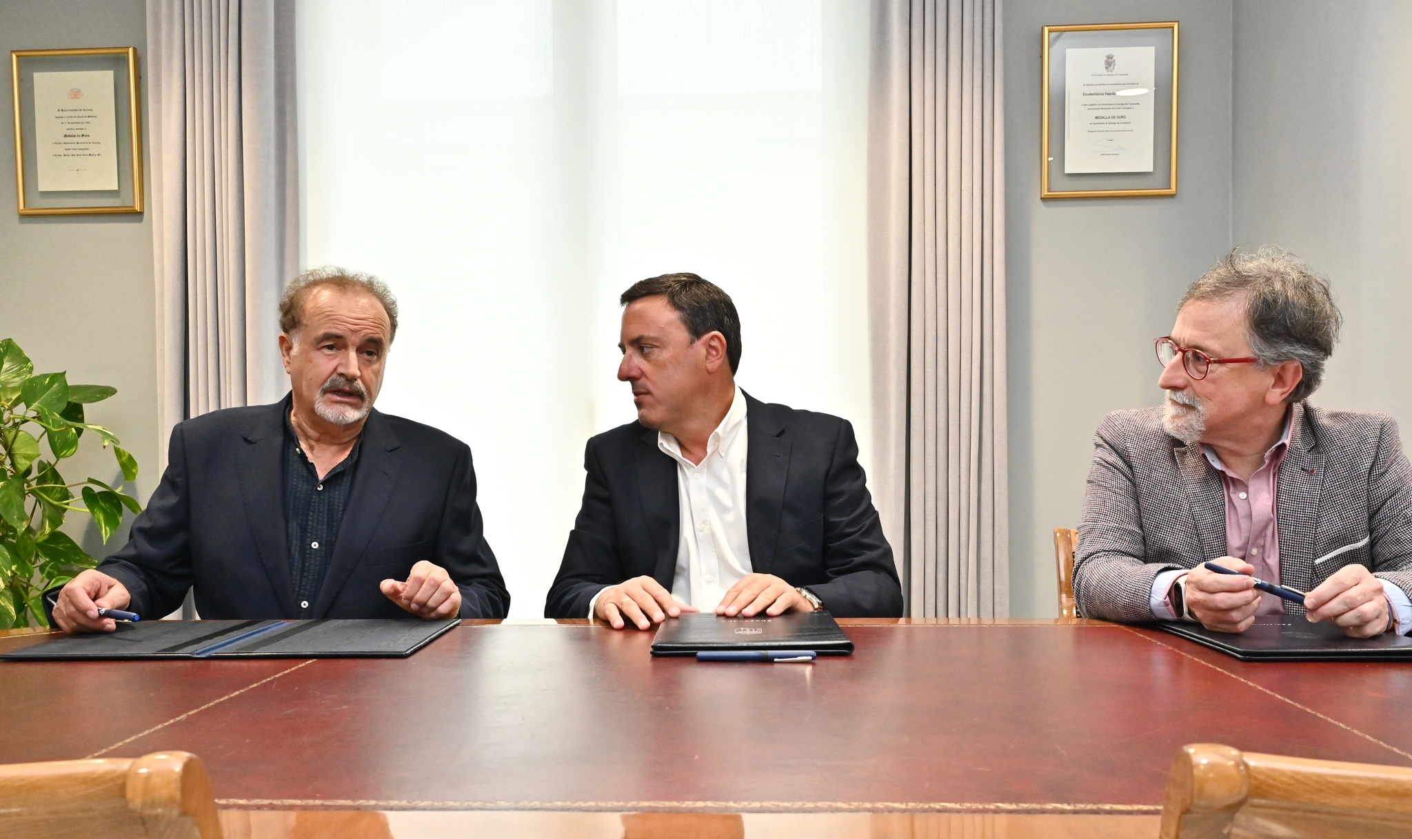 O presidente da Deputación, Valentín González Formoso, o deputado responsable da área de Cultura, Xurxo Couto, e o presidente da Real Academia, Manuel Quintana Martelo, asinaron hoxe o convenio polo que a institución provincial colaborará no financiamento da actividade cunha achega económica de 20.000 euros, que representa o 80% do orzamento total do ciclo.