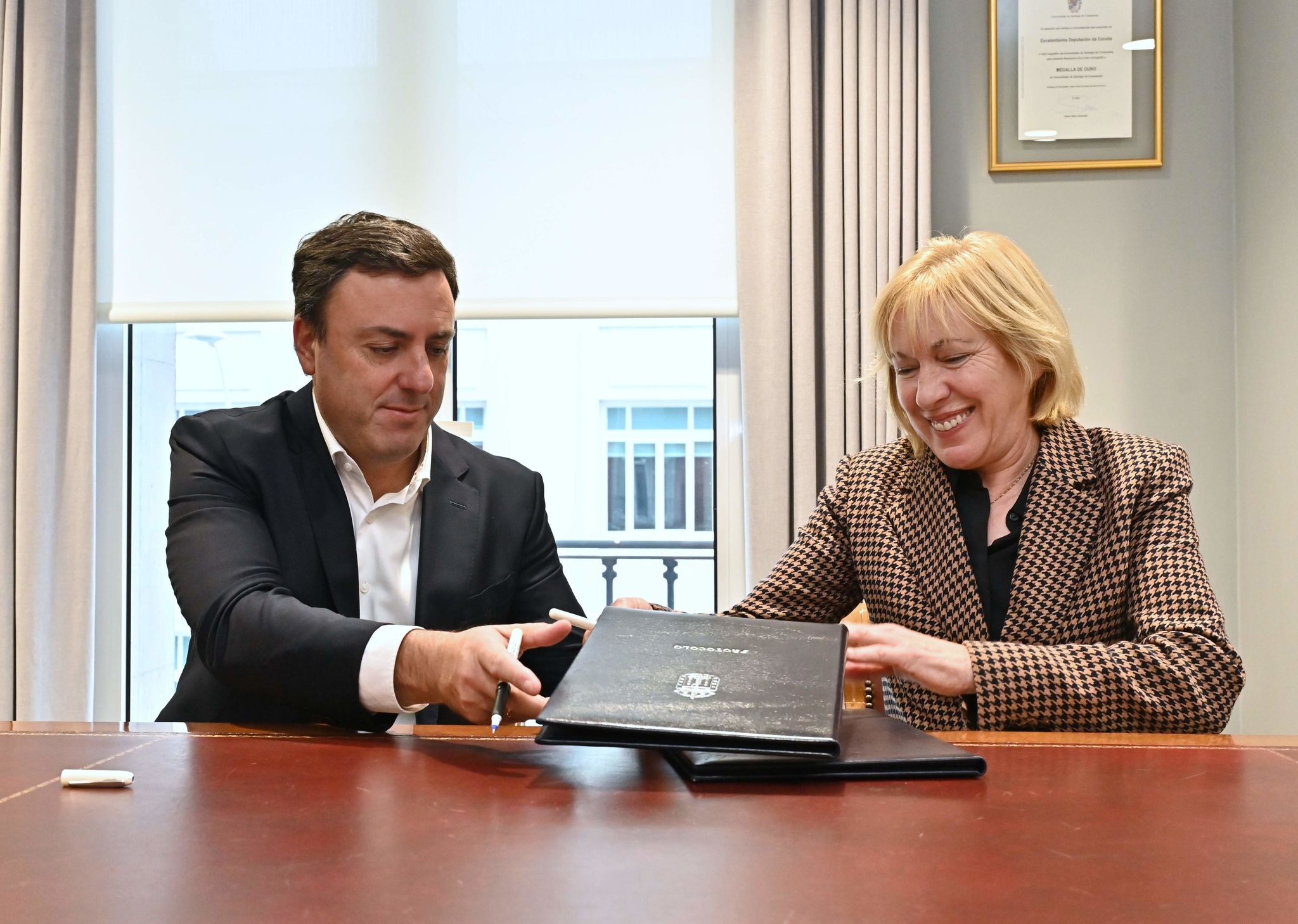 O presidente da Deputación da Coruña, Valentín González Formoso, e a alcaldesa do Concello de Trazo, Josefina Suárez, asinaron hoxe un novo convenio para financiar a reparación das estradas municipais afectadas polos desvíos de tráfico durante as obras DP-7804 para construír unha ponte sobre o rego Gatofero. Ao acto asistiu tamén o deputado de Patrimonio e Contratación, Xose Lois Penas.