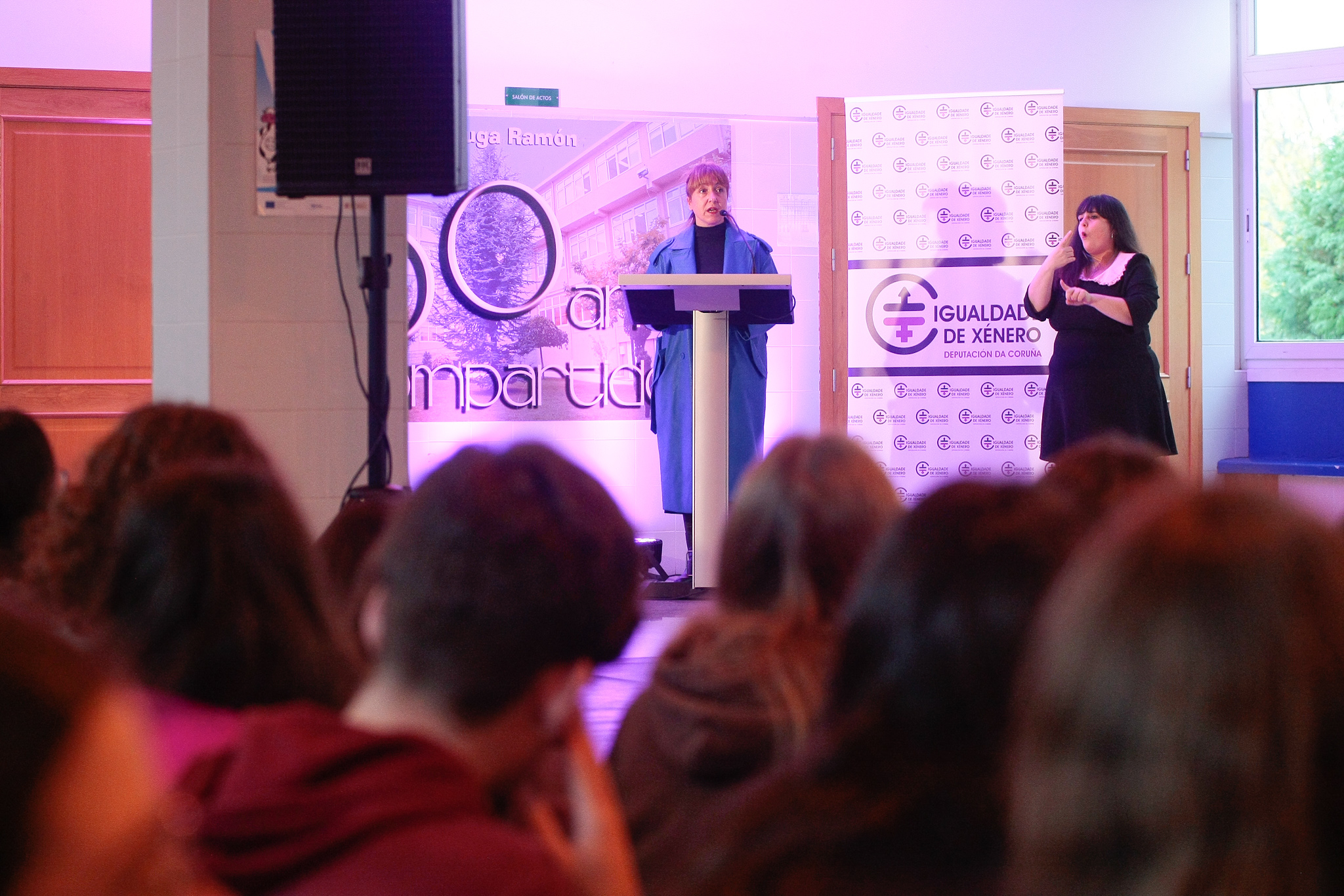 "No traballo de construír unha sociedade xusta e igualitaria non sobra ninguén" asegurou esta mañá a deputada de Igualdade, María Muíño, ante o alumnado do IES Puga Ramón que participou no acto institucional do 25N da Deputación da Coruña.