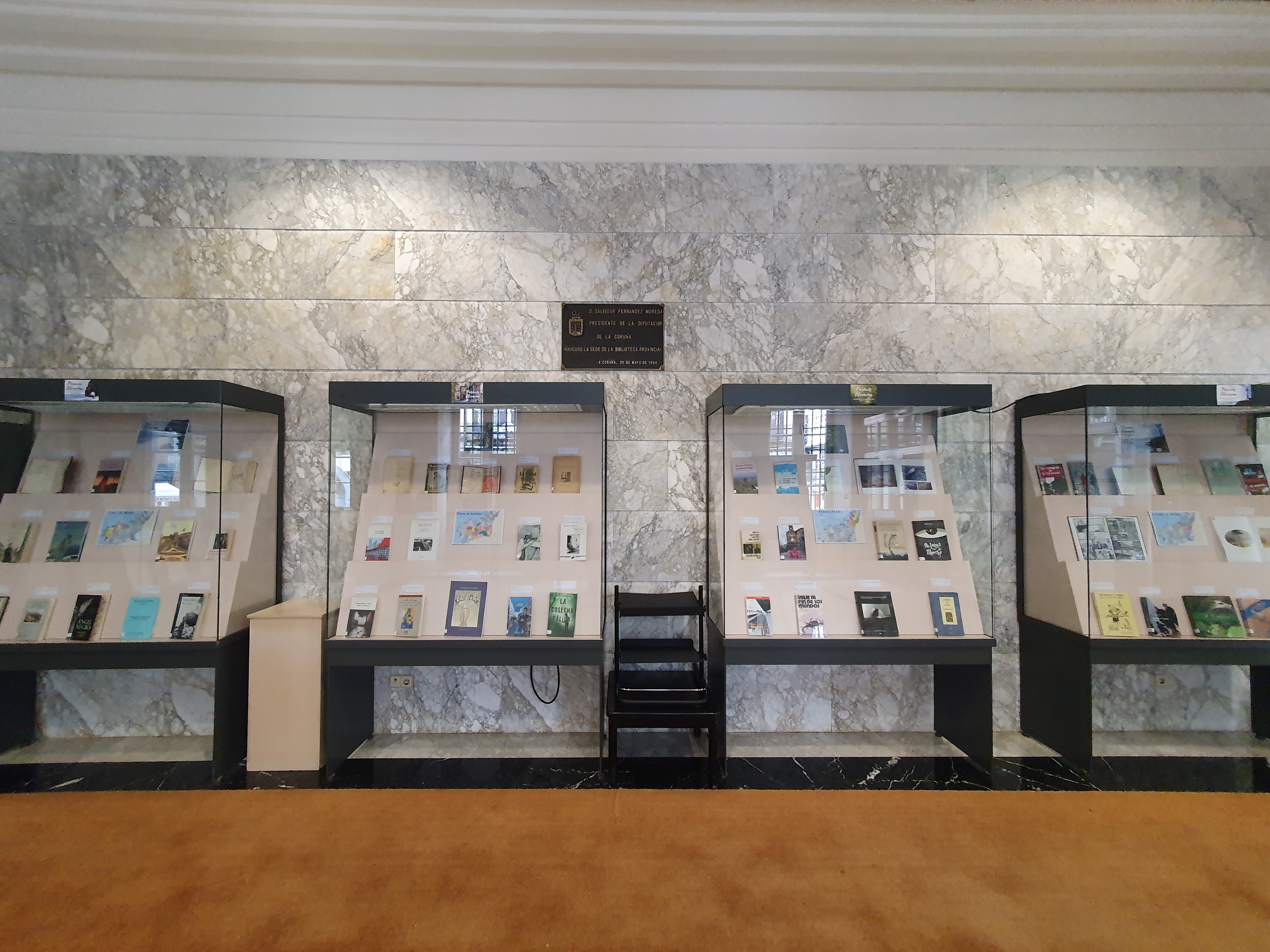 Mostra bibliográfica dispoñible no vestíbulo da Biblioteca sobre literatura ambientada na provincia da Coruña.