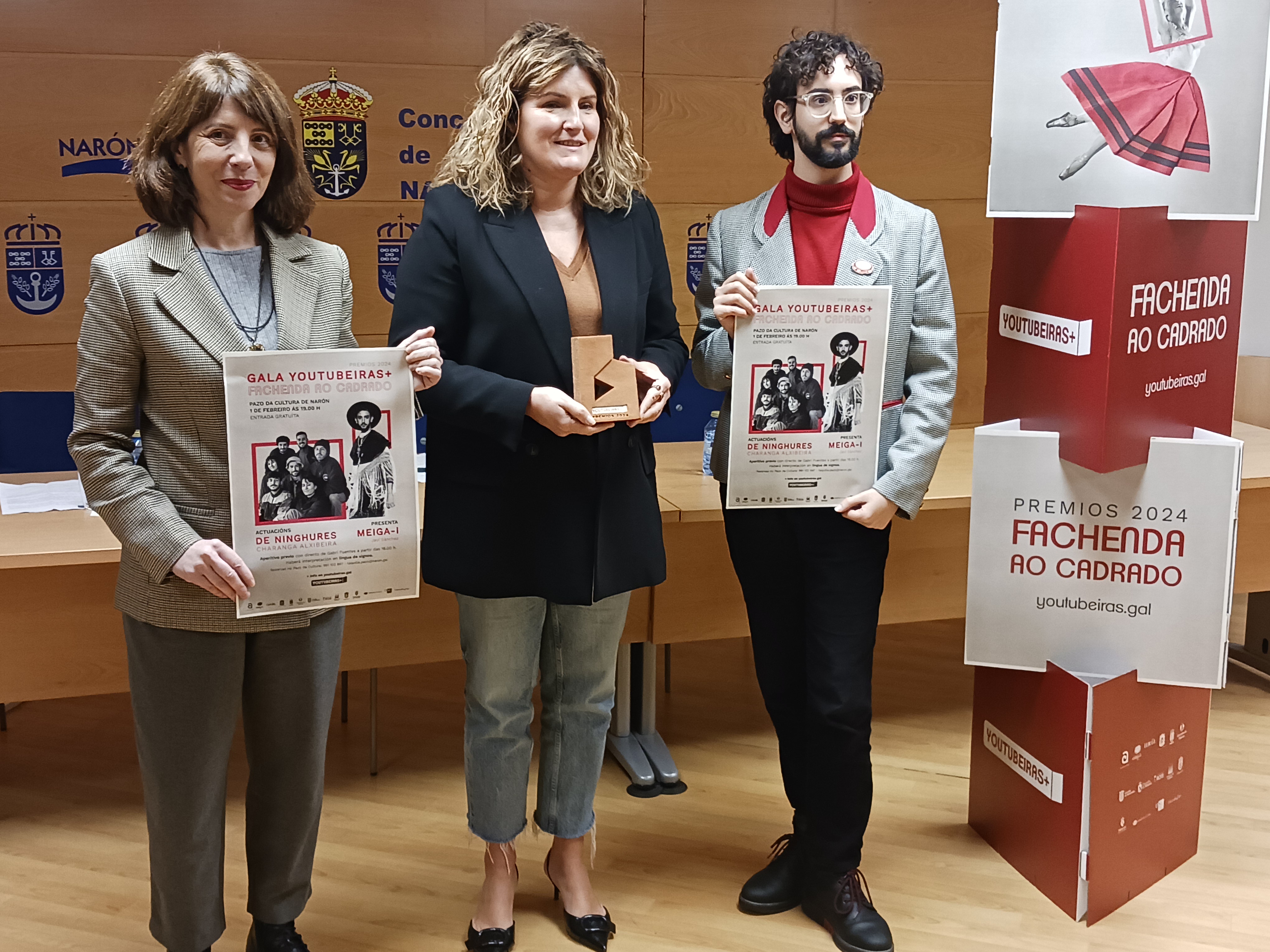 Os Premios Youtubeiras+ anunciaron esta mañá en Narón as canles e persoas finalistas do certame, que, na súa oitava edición e co lema 'Fachenda ao cadrado', abriu a participación aos contidos difundidos na plataforma TikTok. Son vinte as propostas aspirantes a levar o galardón nalgunha das sete categorías do concurso, cuxo palmarés coñecerase na gala final que se vai celebrar o 1 de febreiro, ás 19 horas, no Pazo da Cultura de Narón, conducida por Meiga-i e con música do grupo De Ninghures. Na rolda de prensa de presentación participaron a titular de Igualdade, Lingua e Dereitos Civís da Deputación da Coruña, Sol Agra; a alcaldesa de Narón, Marián Ferreiro, e Meiga-i.