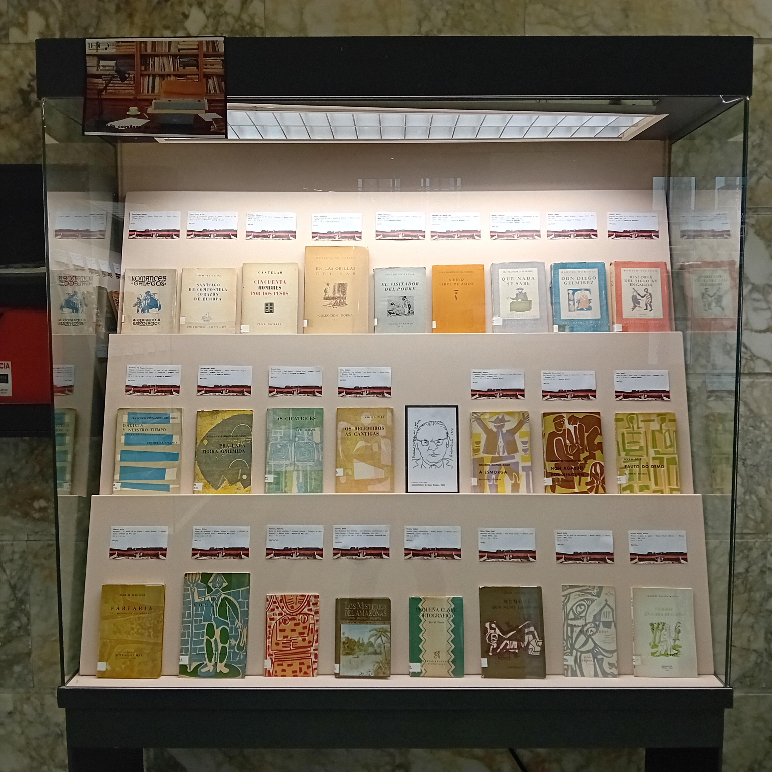 Esta vitrina exhibe materiais de diverso tipo e formato: revistas, folletos literarios e informativos, catálogos de exposicións, libros ilustrados, postais, partituras e libros-cd. É un exemplo da diversidade da produción destas entidades: Canuto Berea, Roel, Fojo, Moret, Lar, Nós, Céltiga, Librigal, Luis Seoane, Alvarellos, Urco, Através, Casa das Peritas e Chan da Pólvora.