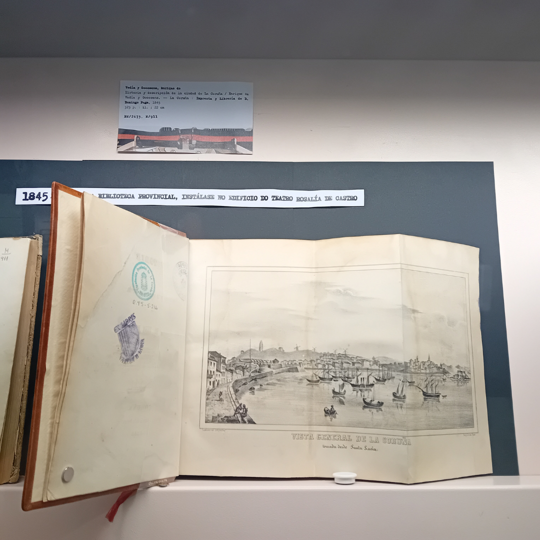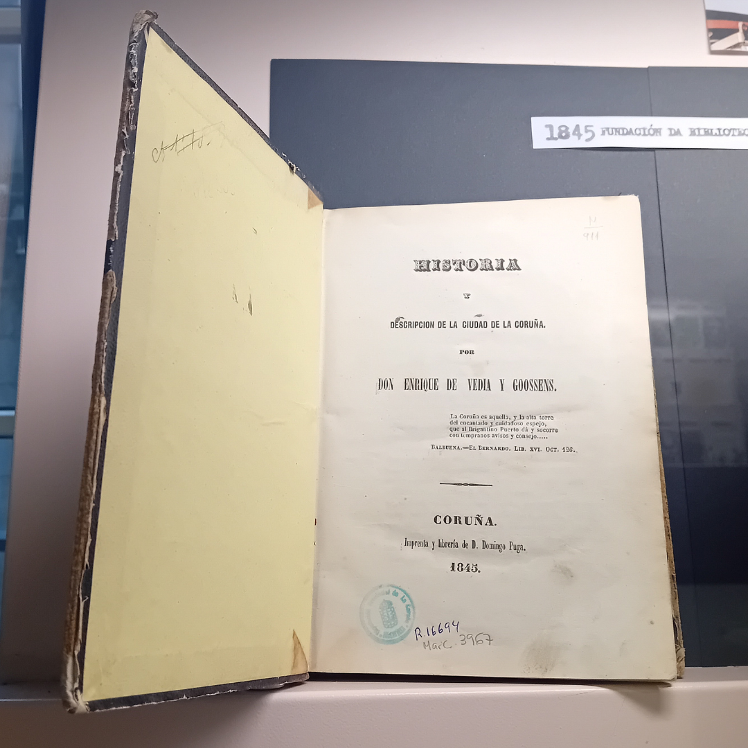 Hoxe queremos falar da obra máis antiga que podedes atopar exposta, xa que foi publicada en 1845, ano que nace a #BPDC: Historia y descripción de la ciudad de La Coruña é unha das primeiras crónicas da cidade da Coruña, por este motivo espertou bastante interese na localidade no seu momento. O seu autor é Enrique de Vedía y Goossens (o gobernador civil da cidade) e foi publicada pola Imprenta e Libraría de D. Domingo Puga.