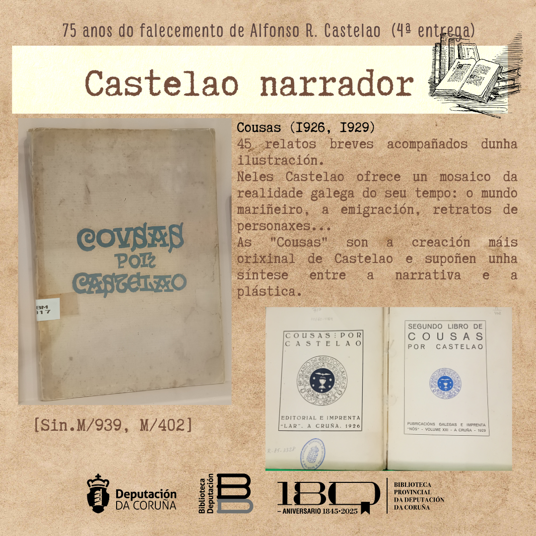 reúne un conxunto de 45 relatos breves acompañados dunha ilustración. Nestes relatos Castelao ofrece un mosaico da realidade galega do seu tempo: o mundo mariñeiro, a emigración, retratos de personaxes... As "Cousas" son a creación máis orixinal de Castelao e supoñen unha síntese entre a narrativa e a plástica. Foi traducida ao castelán,[69] ao italiano,[70] ao éuscaro, ao catalán, ao asturiano e ao inglés.