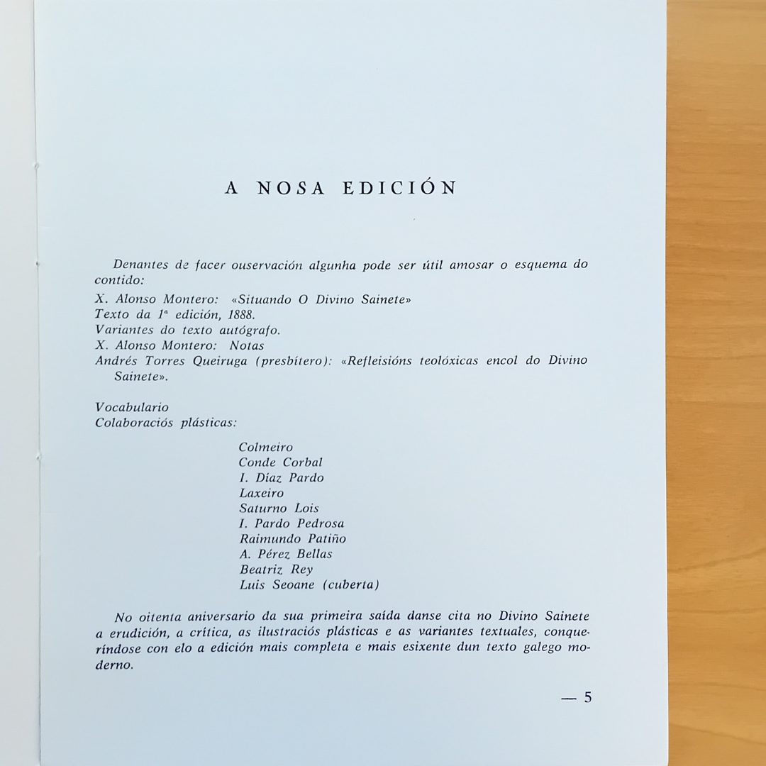 Se algo caracteriza as publicacións desta editorial, tamén na narrativa, é o seu espírito crítico: coñecer a nosa tradición e conectala co contemporáneo. Quizais é por isto que no 1969 decide facer unha edición crítica de "O Divino Sainete" de Manuel Curros Enríquez, unha obra publicada orixinalmente no 1888.