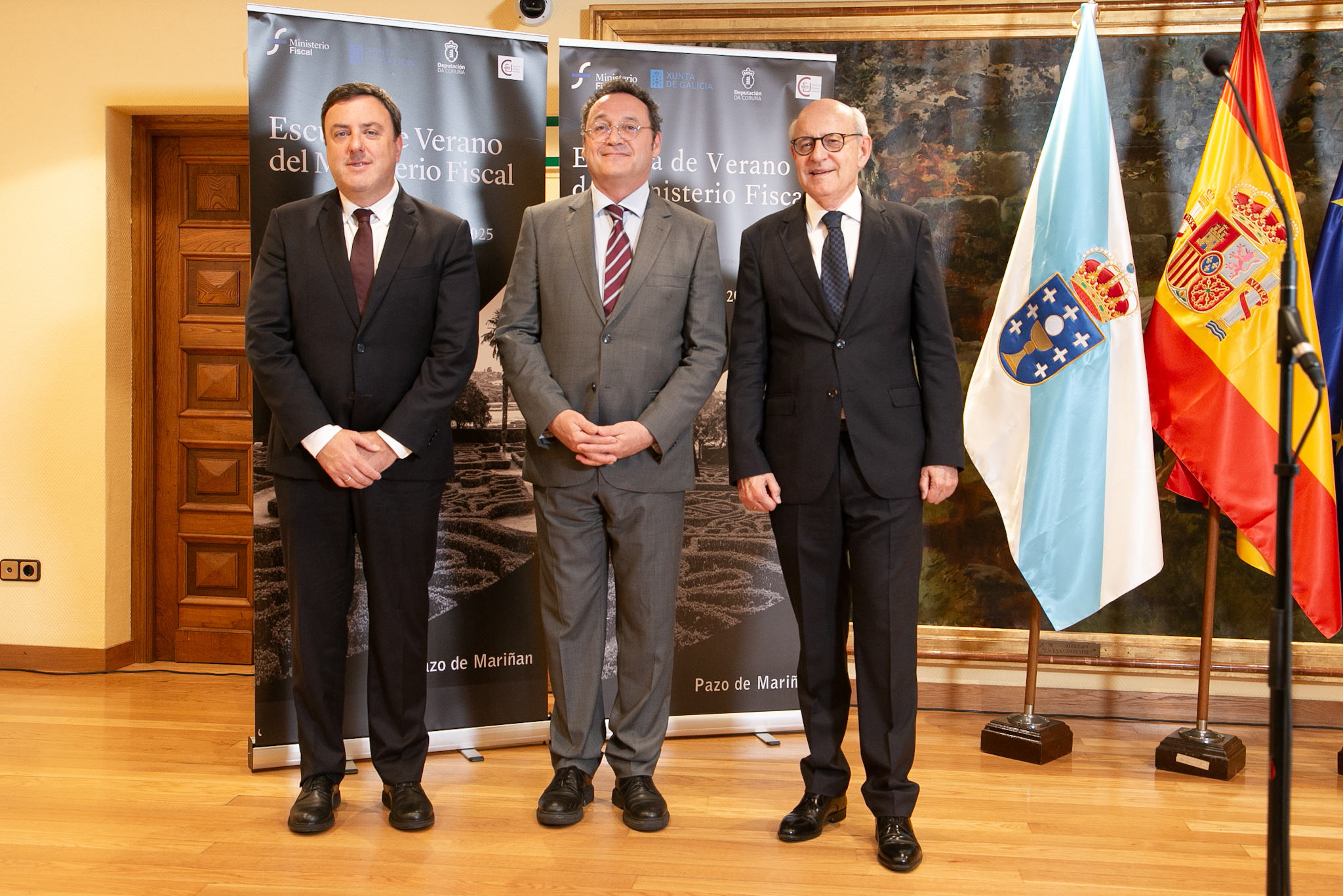 O presidente da Deputación da Coruña, Valentín González Formoso; o fiscal xeral do Estado, Álvaro García Ortiz; e o fiscal superior de Galicia, Fernando Suanzes, participaron hoxe no acto de clausura da Escola de Verán do Ministerio Fiscal, que se celebrou esta semana no Pazo de Mariñán.