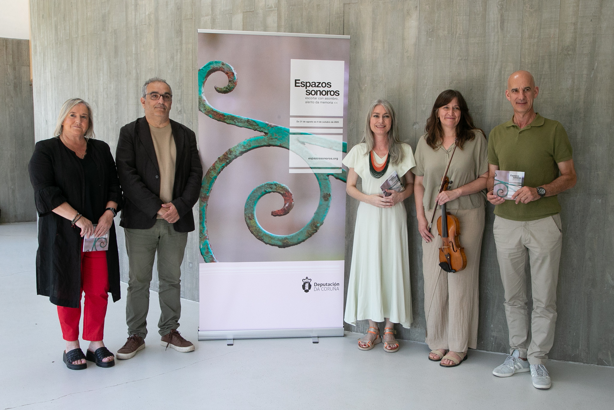 Co lema "Escoitar con asombro, alento da memoria", presentouse esta mañá no Centro Etnográfico de Teixeiro (Curtis) unha nova edición de Espazos Sonoros, o ciclo organizado polo departamento de Patrimonio e Contratación da Deputación da Coruña no que se dan a man a música antiga e o patrimonio cultural e arquitectónico da provincia. Na rolda de prensa interviron o deputado de Patrimonio, Xosé Penas; a directora artística do festival, Belén Bermejo, e o alcalde de Curtis, Javier Francisco Caínzos, quen deron paso á actuación musical de Maria José Pámpano, de Suelen Estar Quartet, unha das formacións protagonistas este ano.