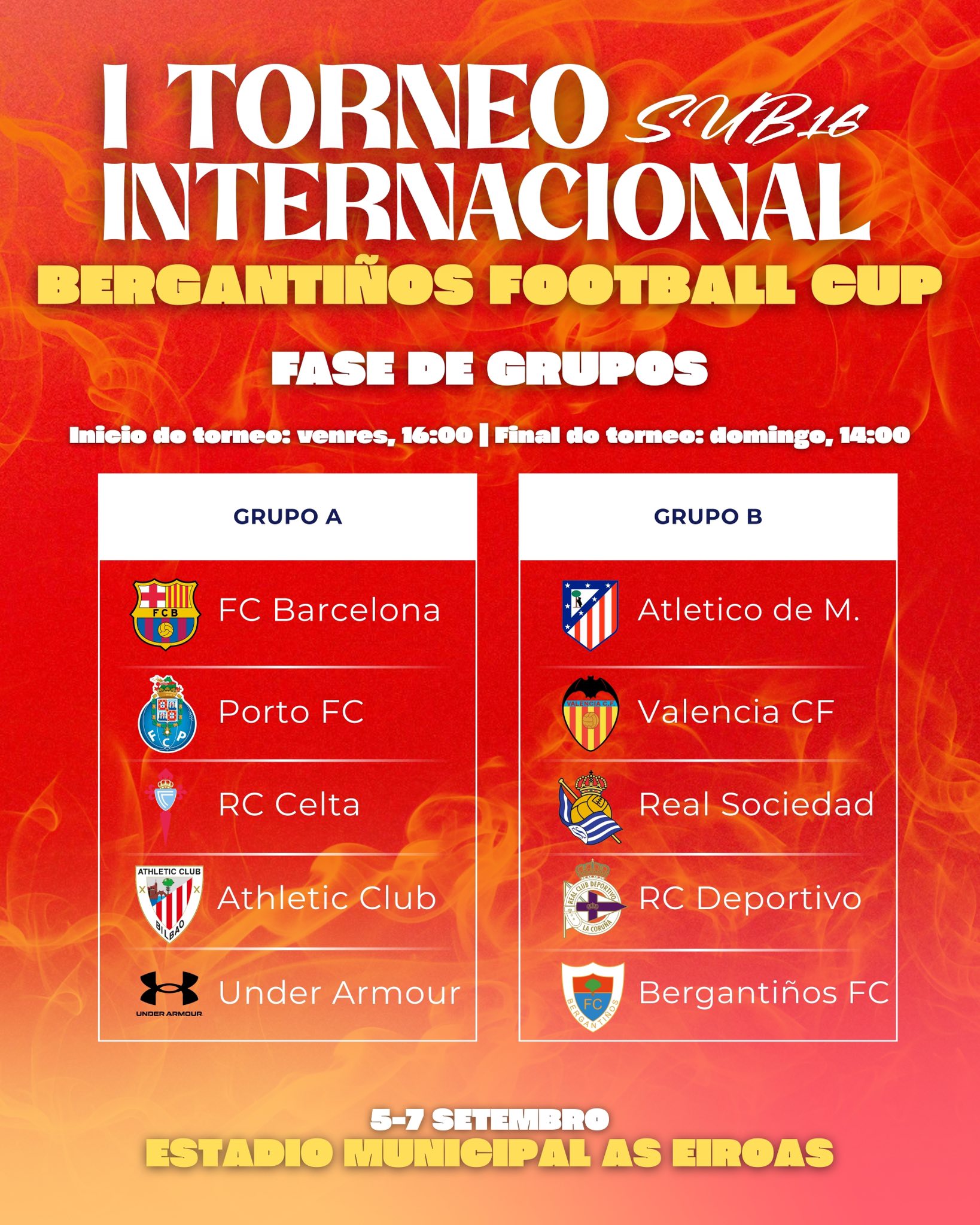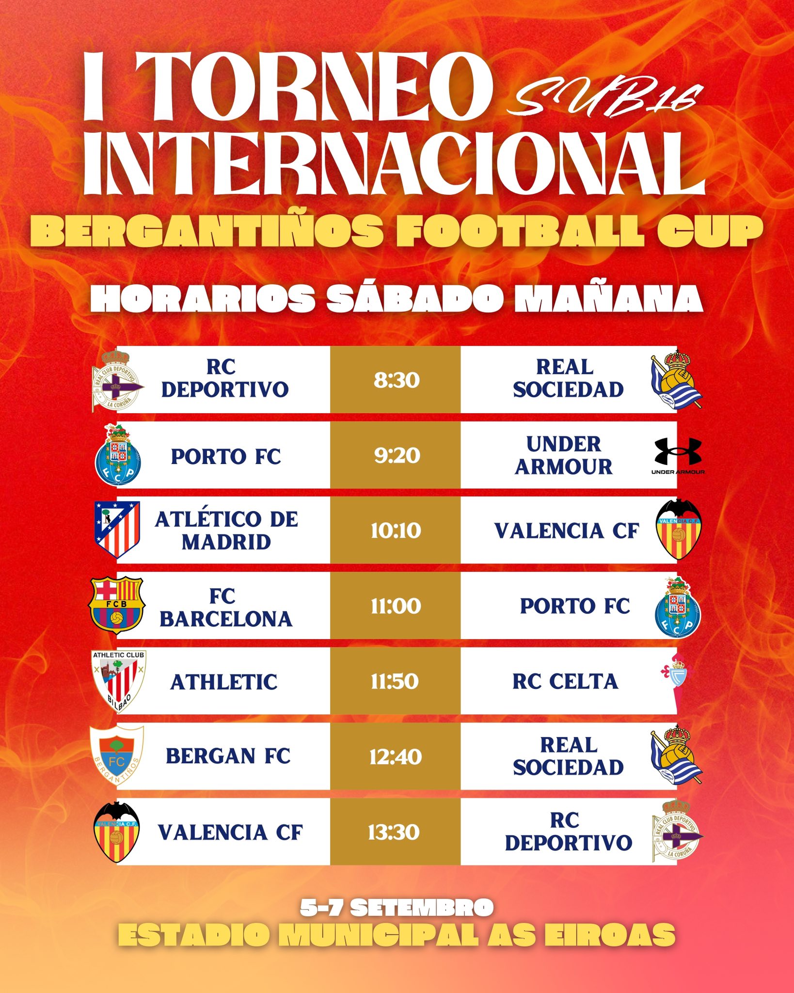 Bergantiños, Celta, Deportivo, Barcelona, Atlético de Madrid, Porto, Athletic Club, Valencia, Real Sociedad e o combinado xaponés Next Japan Under Armour competirán polo trofeo do 5 ao 7 de setembro no campo carballés das Eiroas