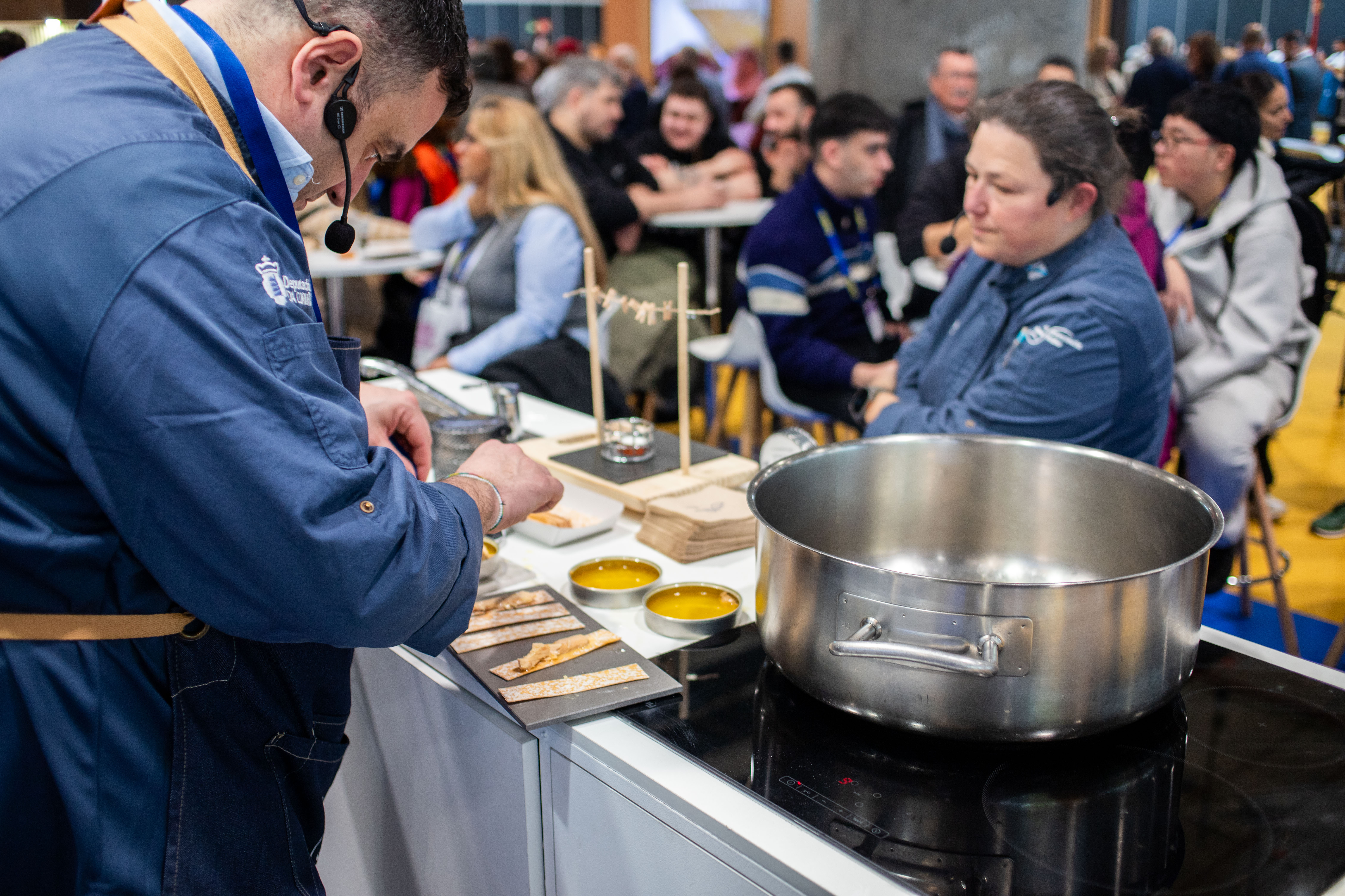 A cociña en directo tivo un papel central coa dobre participación de Fabián Mouzo e Lara Alvarellos, do restaurante O Camiño Fala de Mazaricos, que elaborou callos ao estilo de Carnés e albóndegas de atún en salsa verde. Na primeira das súas demostracións, as longa ringleira de persoas dispostas a probar o prato acabaron en poucos minutos coas racións dispoñíbeis.