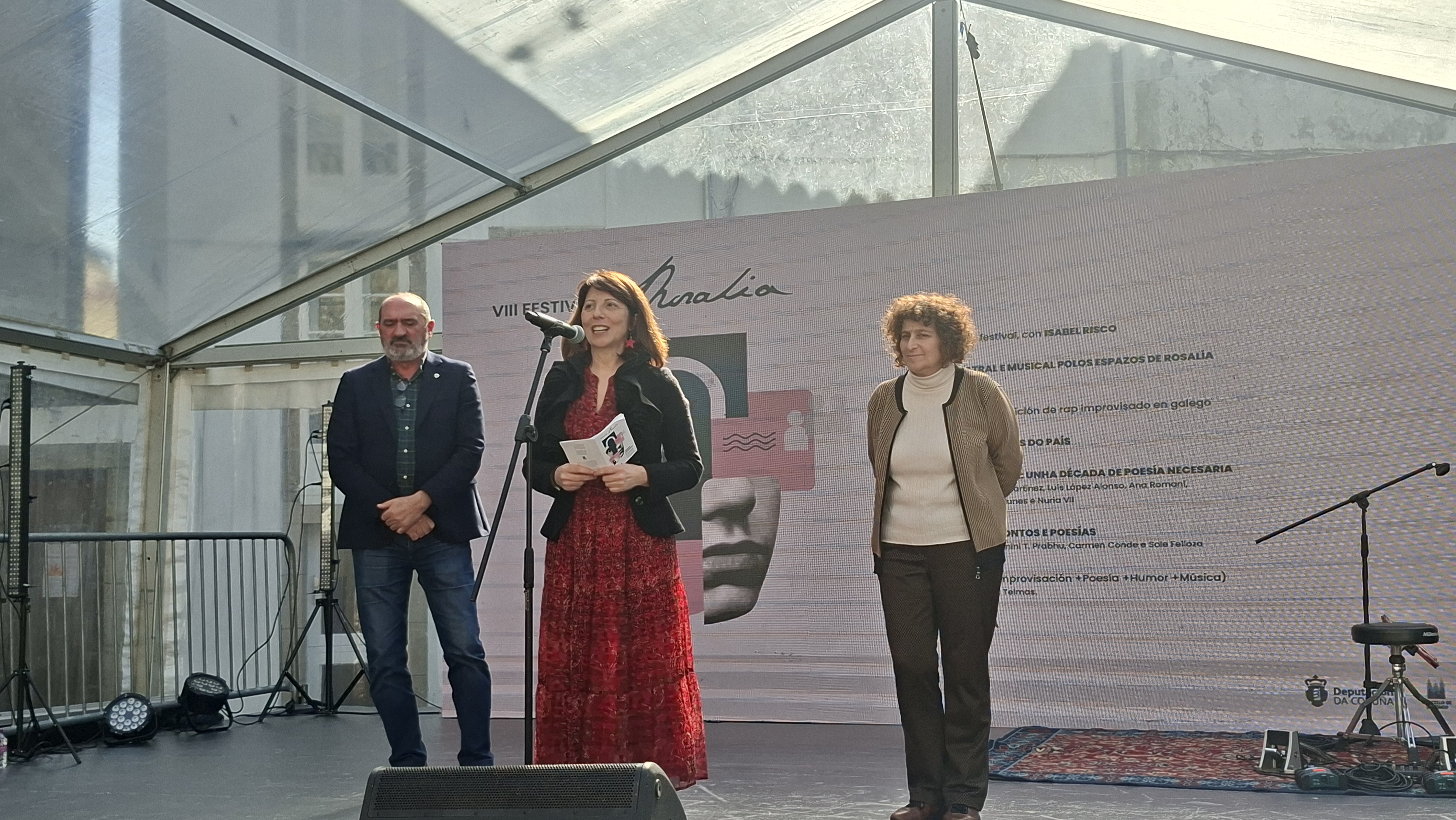 O Festival Rosalía, organizado pola Deputación da Coruña en colaboración co Concello de Santiago de Compostela, botou a andar hoxe na súa oitava edición. «Este festival non só reivindica a figura de Rosalía, senón que socializa o seu legado», salientou na inauguración oficial deste encontro a deputada de Igualdade, Lingua e Dereitos Civís da Deputación da Coruña, Sol Agra. Na súa intervención tamén puxo en valor a pegada histórica da autora de Follas novas nos ámbitos da lingua, do feminismo e mesmo da ecoloxía. Neste último punto, Agra lembrou a posición que a autora amosou no seu día fronte á tala indiscriminada na Carballeira de Conxo, aló cara a 1881.